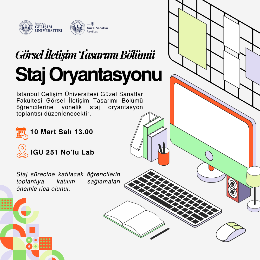 İstanbul Gelişim Üniversitesi Güzel Sanatlar Fakültesi Görsel İletişim Tasarımı Bölümü tarafından, staj sürecine katılacak öğrenciler için staj oryantasyon toplantısı düzenlenecektir.